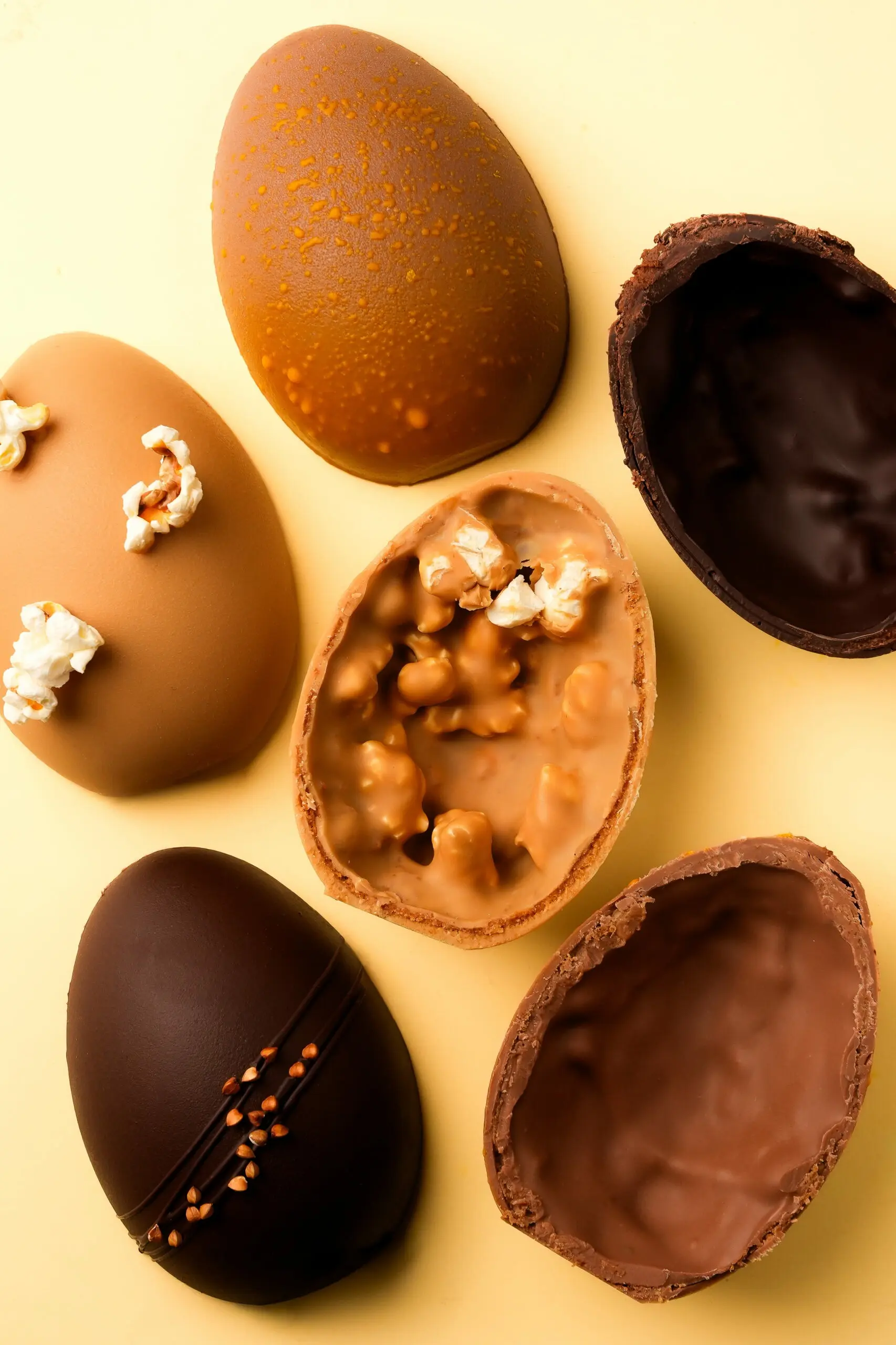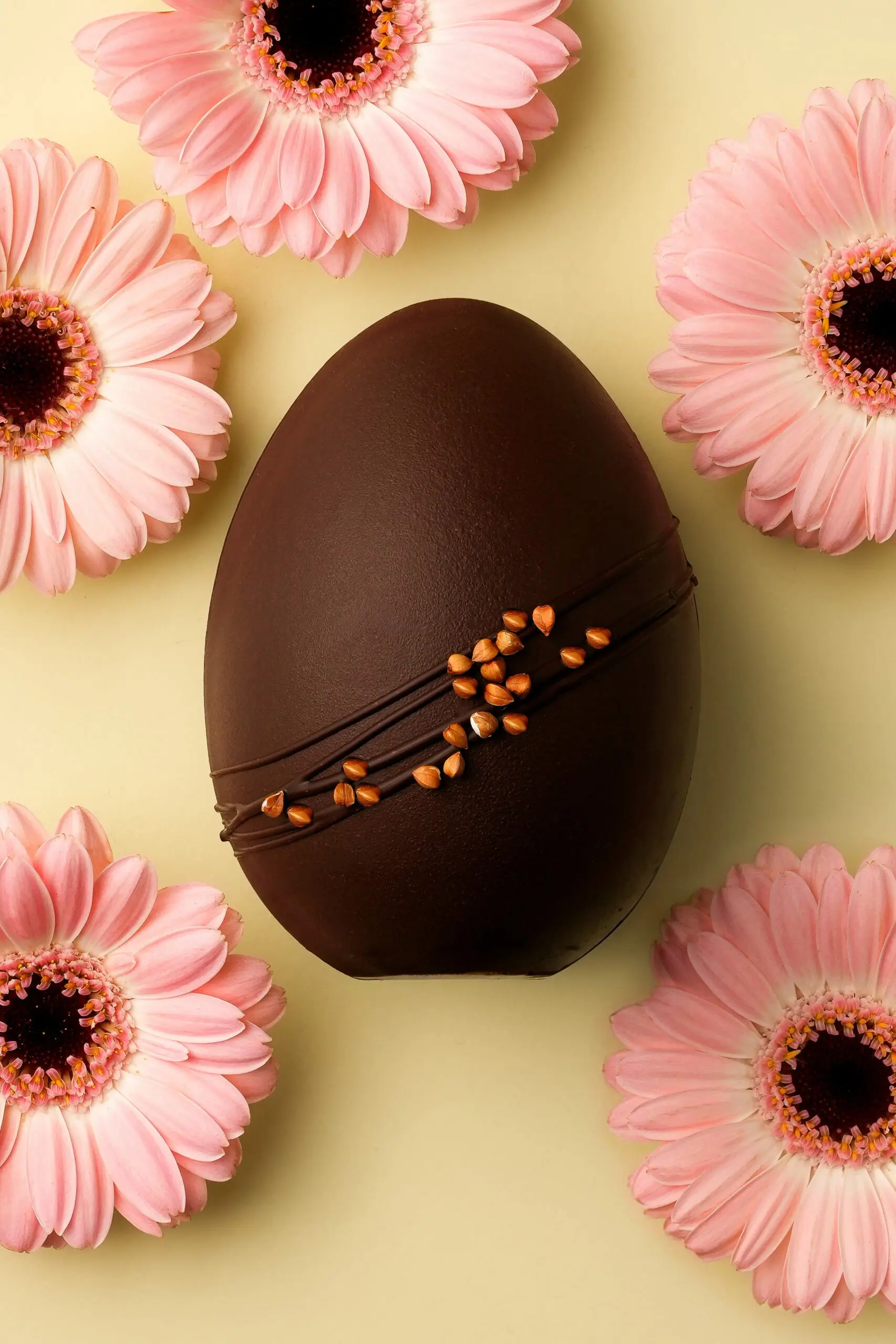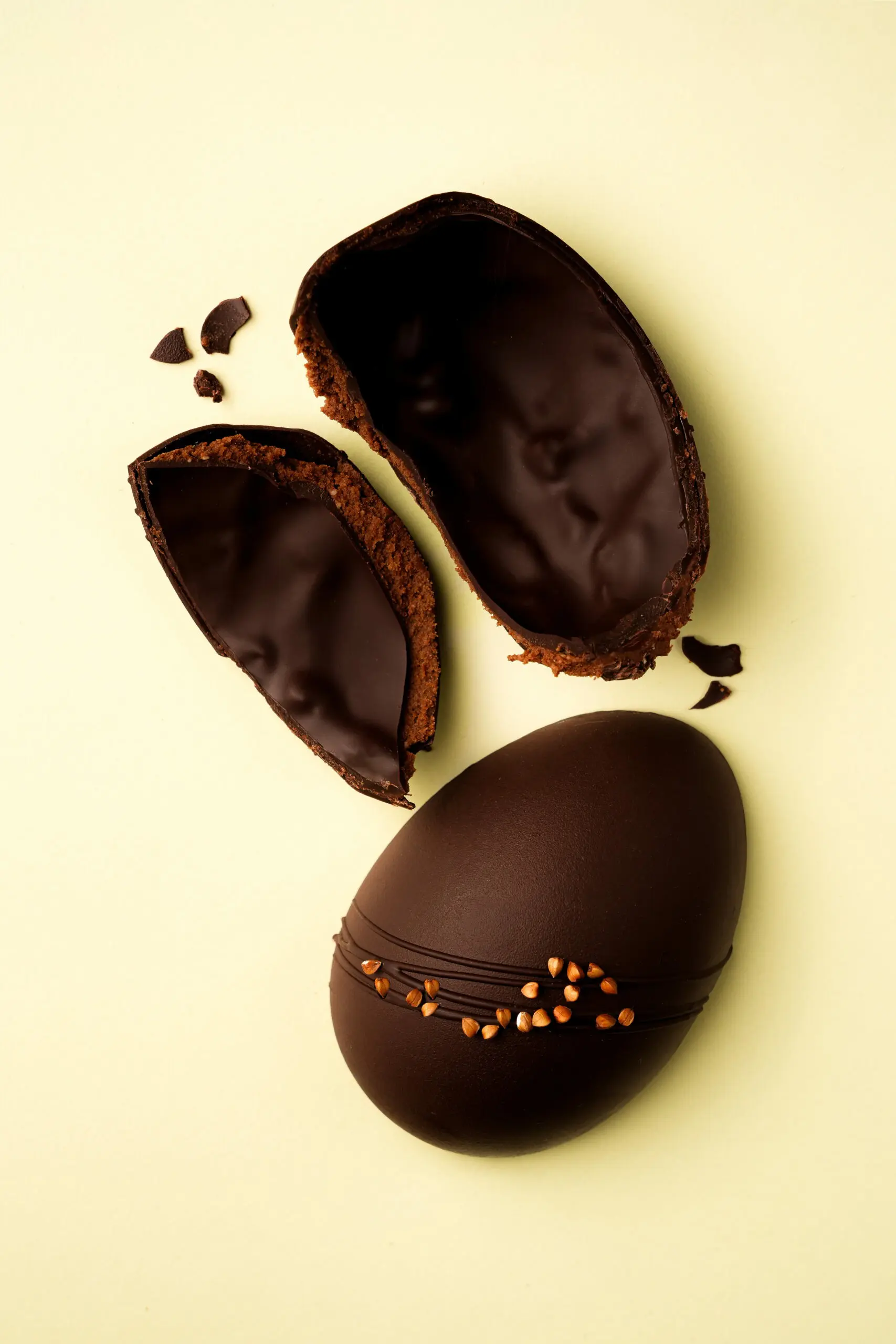 Un Ĺ“uf en chocolat noir intense garni d’un pralinĂ© au sarrasin torrĂ©fiĂ©. Le sarrasin apporte des notes de cĂ©rĂ©ales grillĂ©es et biscuitĂ©es, presque caramĂ©lisĂ©es, qui se marient parfaitement avec l’amertume du chocolat noir.