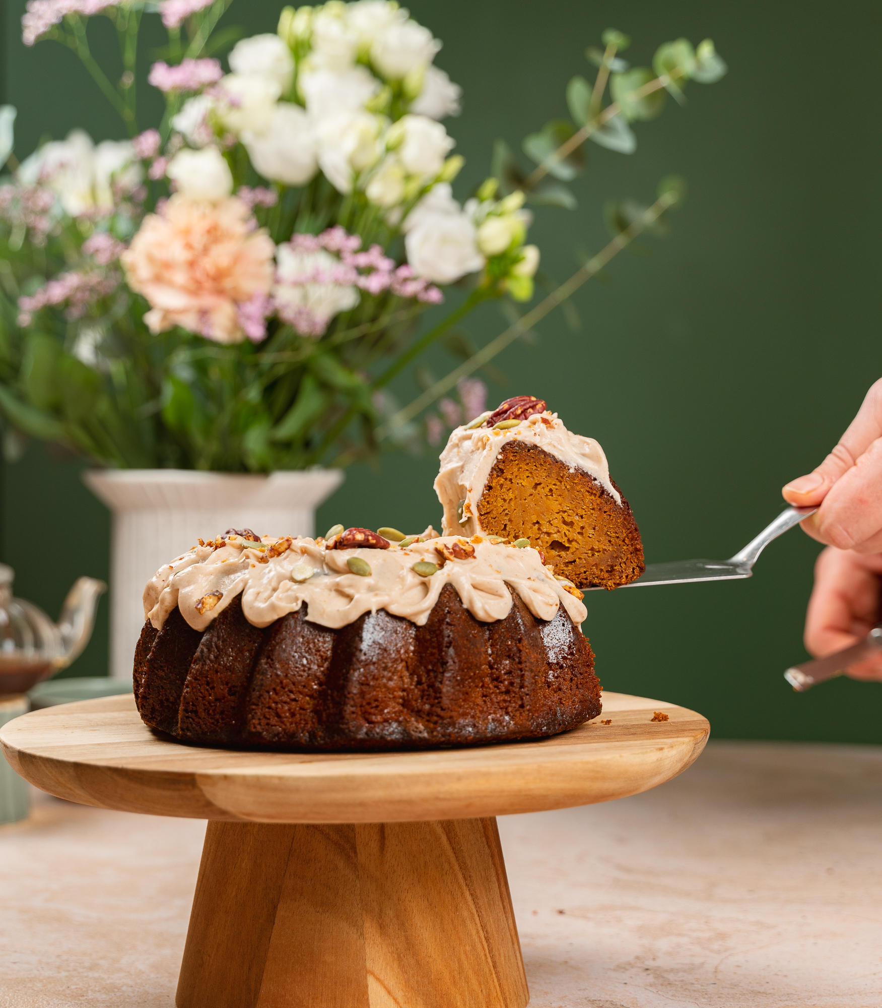 Cake moelleux au potimarron et épices hivernales surplombé d’un glaçage philadelphia et fruits secs
