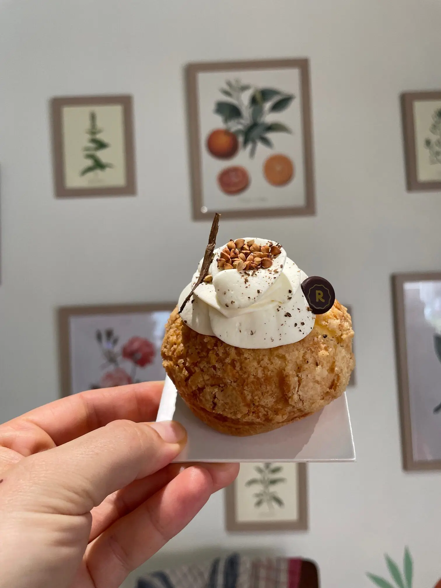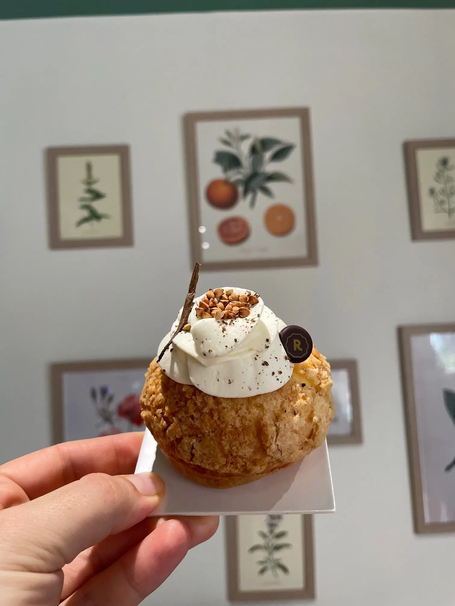 Pâte à chou craquelin, ganache montée vanille, coeur caramel au sarrasin, croustillant sarrasin