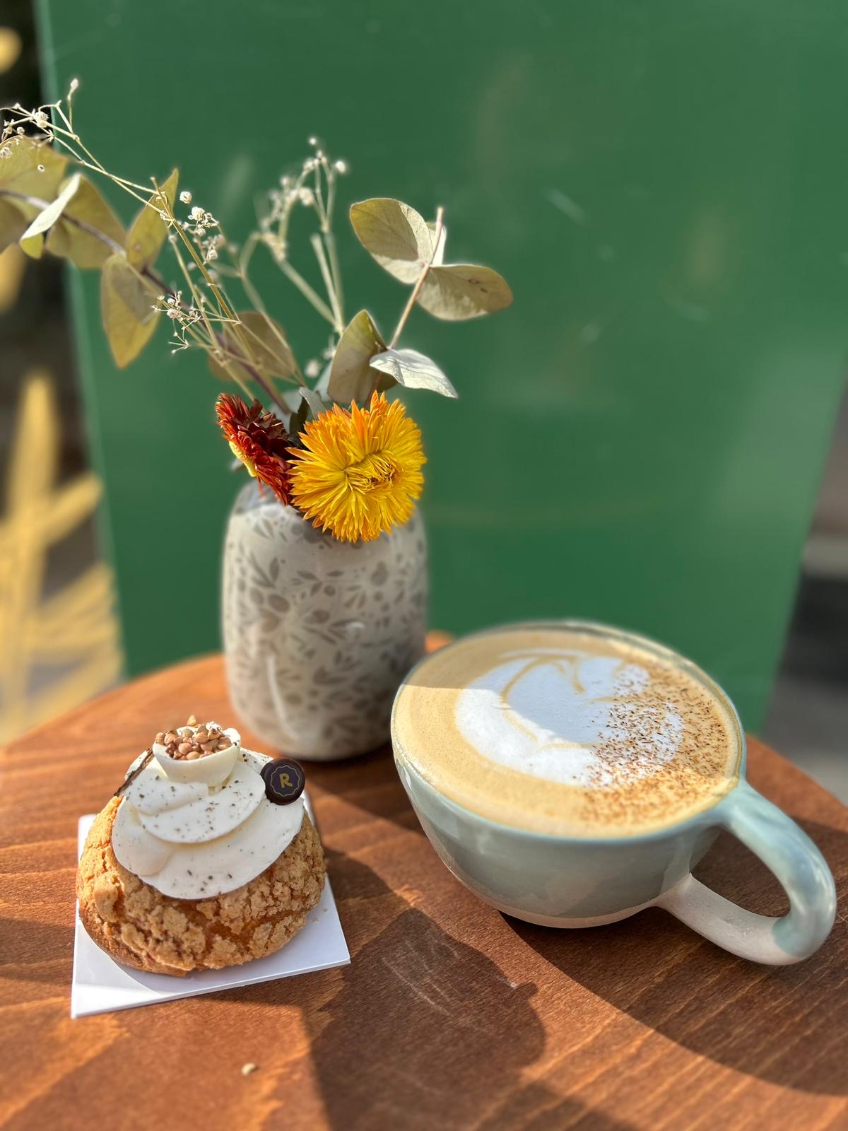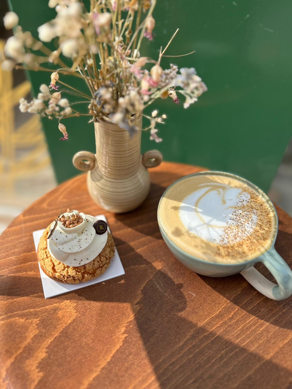 Un chou gourmand à la vanille et au coeur caramel infusé au sarrasin sur un croustillant au sarrasin