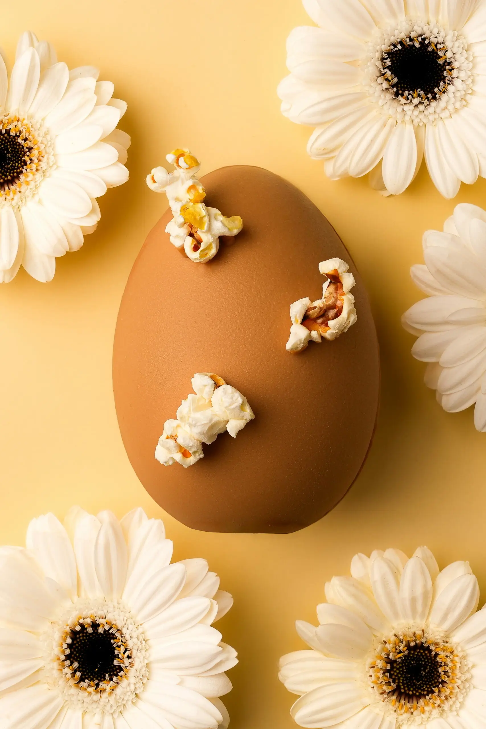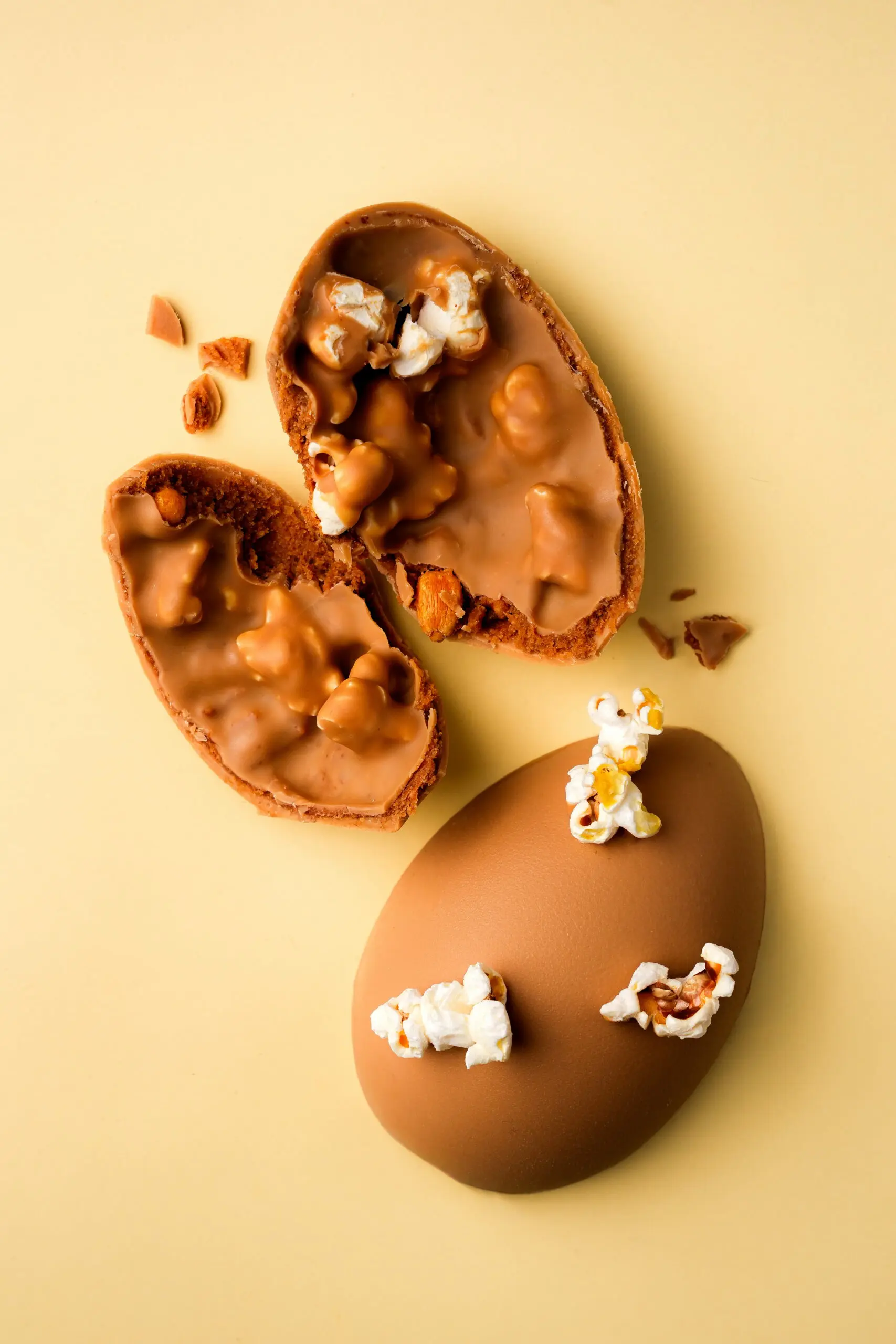 Un œuf de pâques gourmand au chocolat dulcey garni de praliné mais grillé et pop corn entiers : parfait pour une soirée ciné !