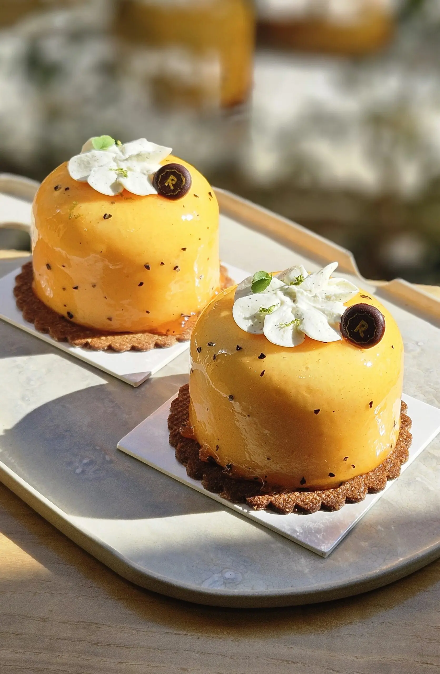 Un entremets noix de coco et gingembre très frais avec une pointe de mangue